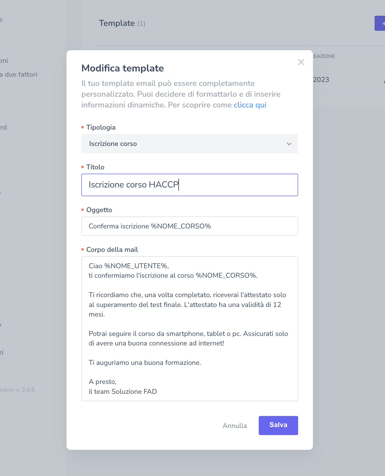 Puoi creare dei template email ad hoc per la tua attività. È possibile creare diverse tipologie di template email personalizzate dirette agli studenti: