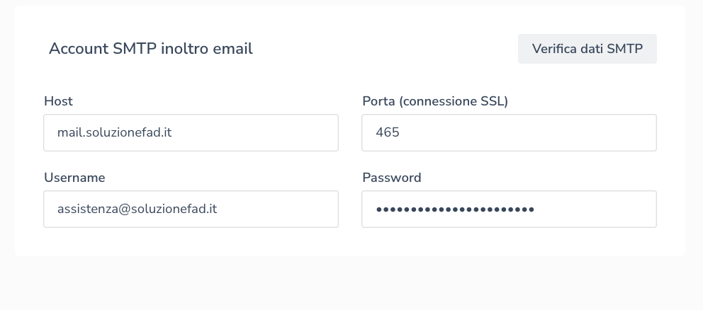 Se la tua piattaforma è installata su un dominio di tua proprietà, al fine di consentire un invio sicuro delle email, è necessario inserire l'account SMTP ad esso legato.
