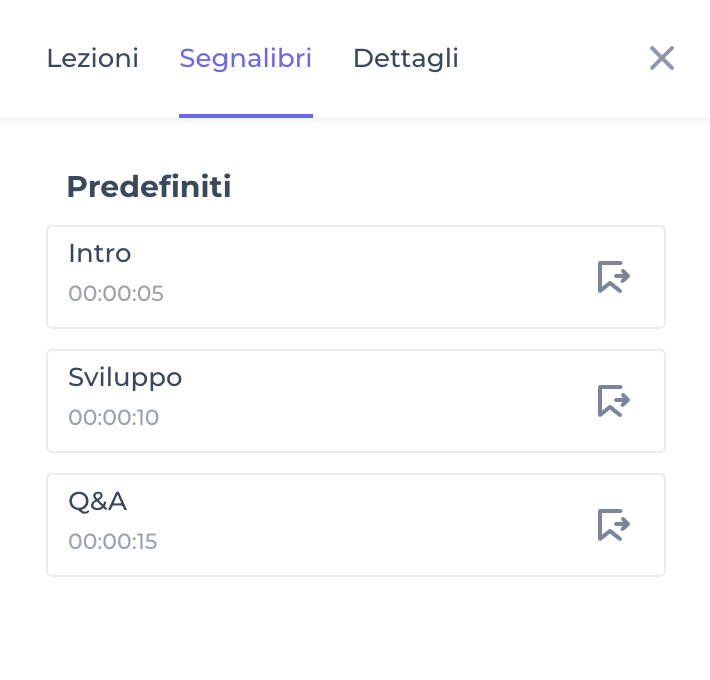 Gli studenti possono accedere ai segnalibri inseriti all'interno della lezione, nella sezione Segnalibri > Predefiniti. Al clic verranno portati direttamente nel punto a cui questi corrispondono.