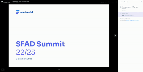 Per evitare che la lezione risulti completata in anticipo, si consiglia di aggiungere una slide finale “placeholder” (anche vuota), così da garantire che tutti i contenuti vengano visualizzati fino alla fine prima che venga registrato il completamento.