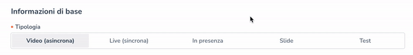 La lezione asincrona video viene svolta tramite il caricamento di video in formato mp4, m4v e tutti i formati compatibili con i browser web. I file possono essere caricati nello specifico box scegliendoli dal proprio dispositivo o dall'archivio della piattaforma.