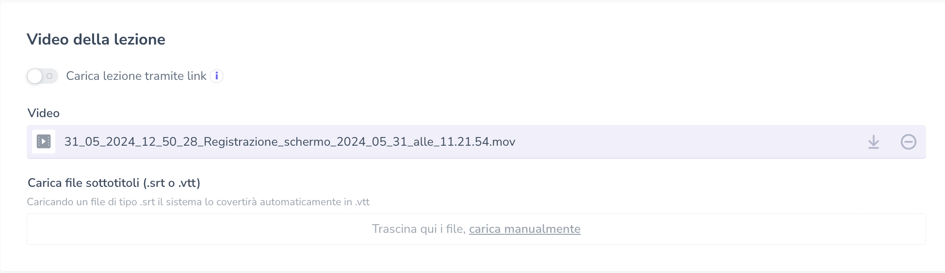 Vuoi creare una lezione con solo materiale didattico da scaricare? Utilizza la modalità Video e carica il tuo file. In questo modo, a seguito di download, la lezione risulterà completata!