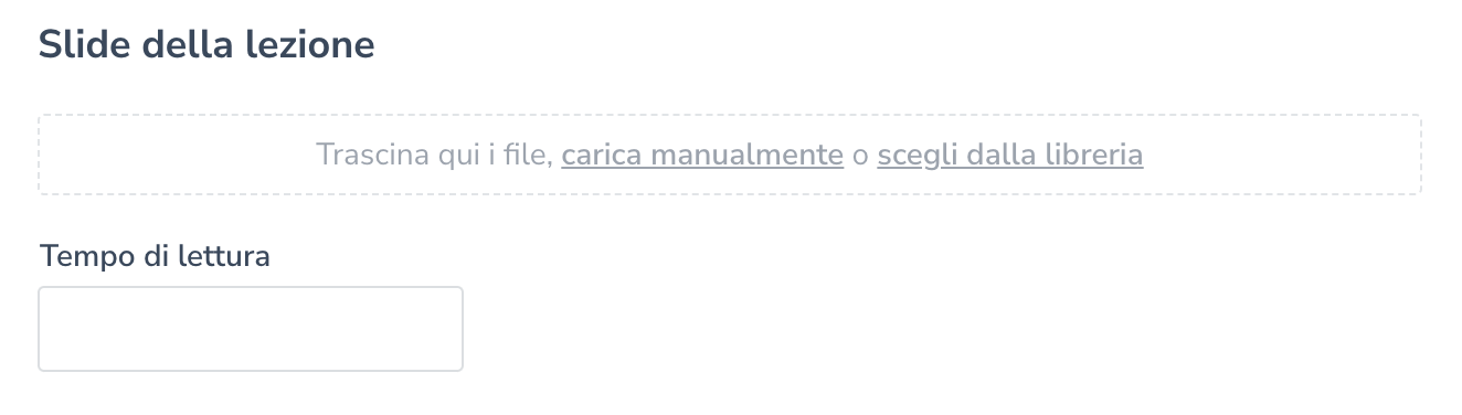 Il formato del contenuto da caricare sarà il pdf. In fase di creazione, avrai la possibilità di inserire il tempo di lettura ovvero una stima della durata di fruizione del contenuto da parte dell'utente.