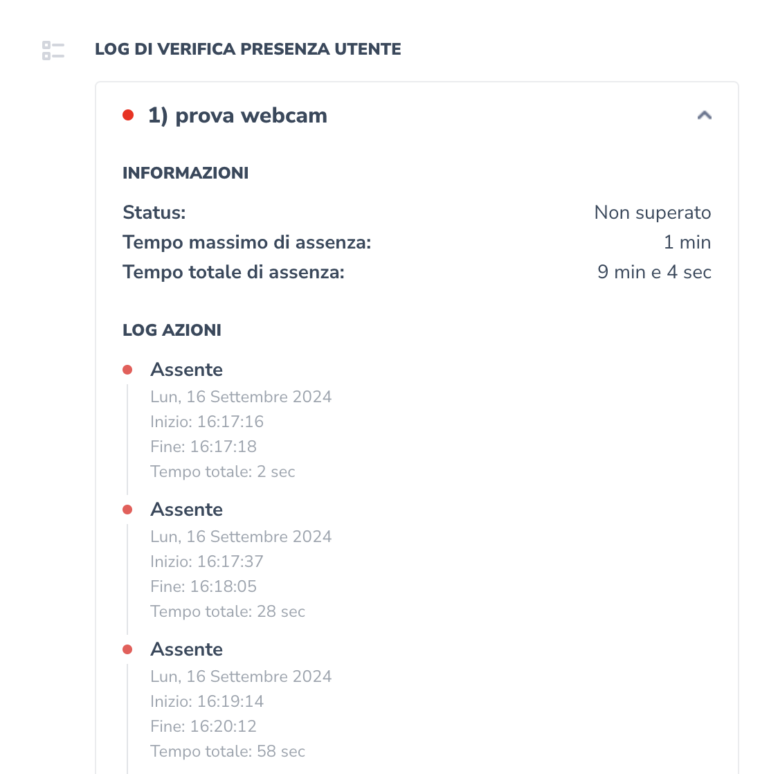 Cosa vuol dire log cumulativi? Sono la somma di tutte le rilevazioni del movimento fuori inquadratura del discente. Ciò vuol dire che, se il tempo massimo di assenza impostato è 1 minuto, al fine di analizzare la presenza o meno su quella specifica lezione, verranno sommati tutti i secondi che il partecipante ha passato fuori inquadratura.