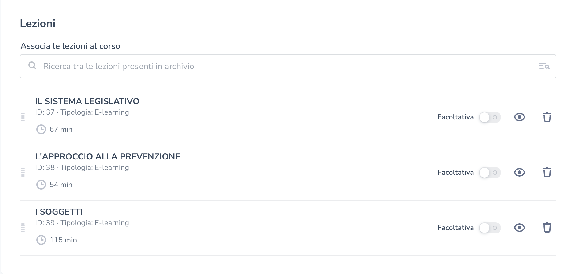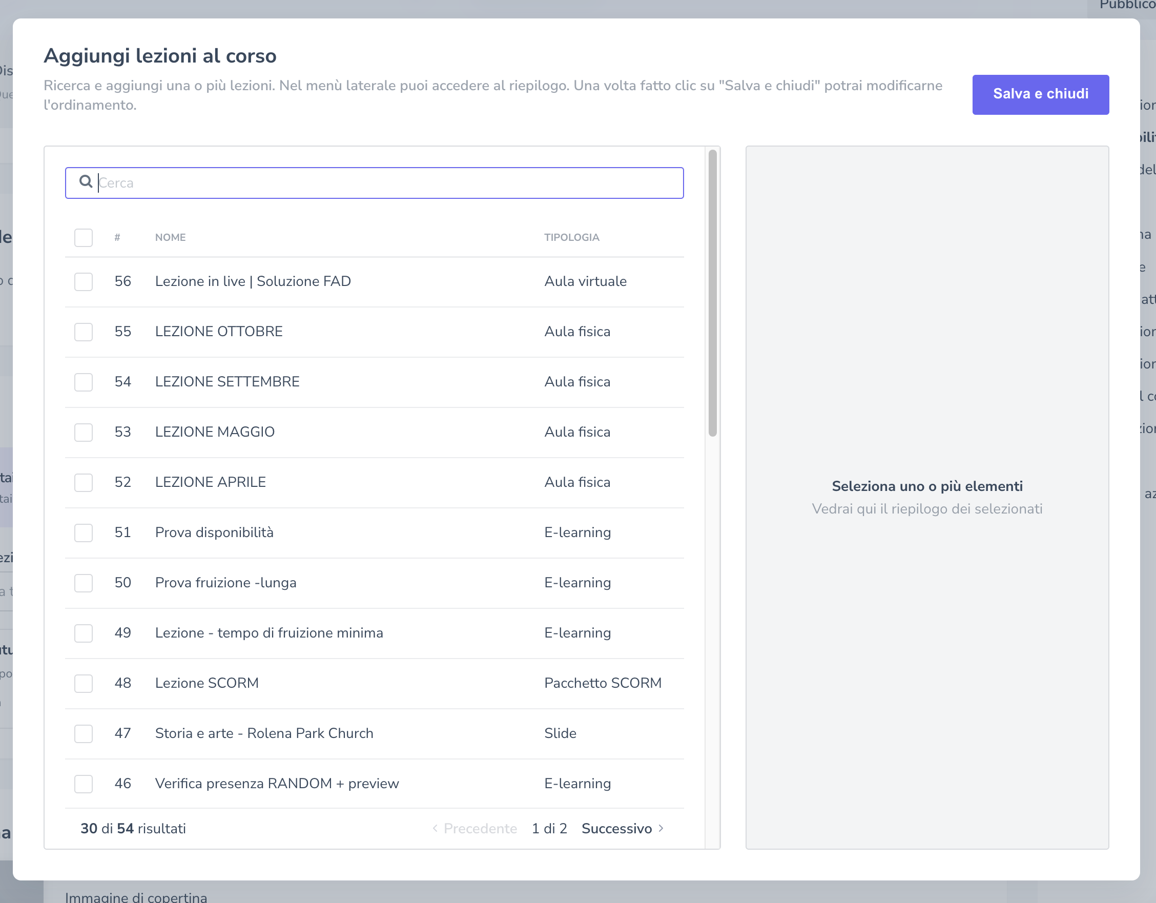 Cliccando sulla lente di ricerca avrai la possibilità di ricercare e inserire le lezioni che hai precedentemente creato potendole selezionare e associare massivamente al corso