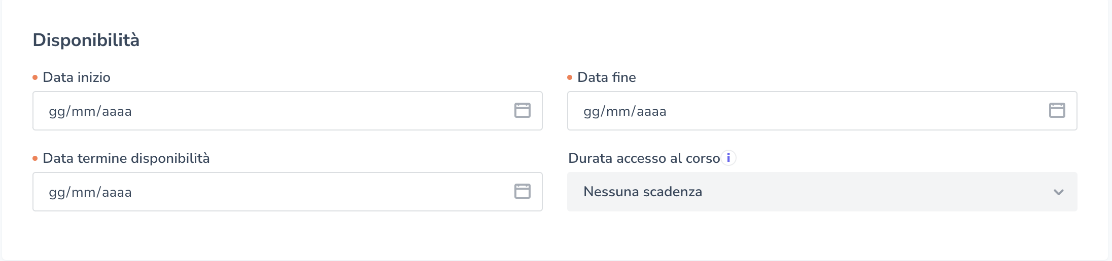 Data termine disponibilità: indica la data ultima entro cui gli utenti possono accedere al corso e a tutti i suoi materiali didattici.