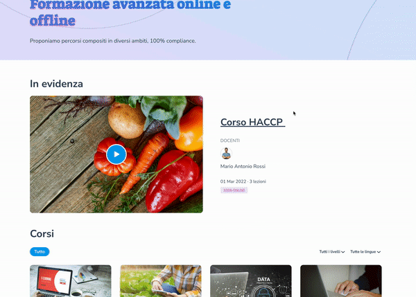 Il video e la brochure, saranno resi per lo più accessibili se si ha a disposizione il catalogo online e-commerce nell’installazione, per consentire agli utenti, anche non iscritti, di esplorare il corso prima di acquistarlo.