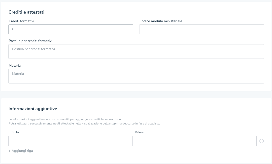 Se il corso prevede il rilascio di crediti formativi, è possibile aggiungerli direttamente. Inoltre, puoi configurare attestati personalizzati, includendo informazioni non presenti nell’anagrafica principale utilizzando le informazioni aggiuntive.