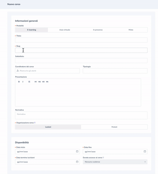 Modalità ovvero la descrizione della tipologia del corso a scelta tra e-learning, aula virtuale, evento, in presenza o misto.