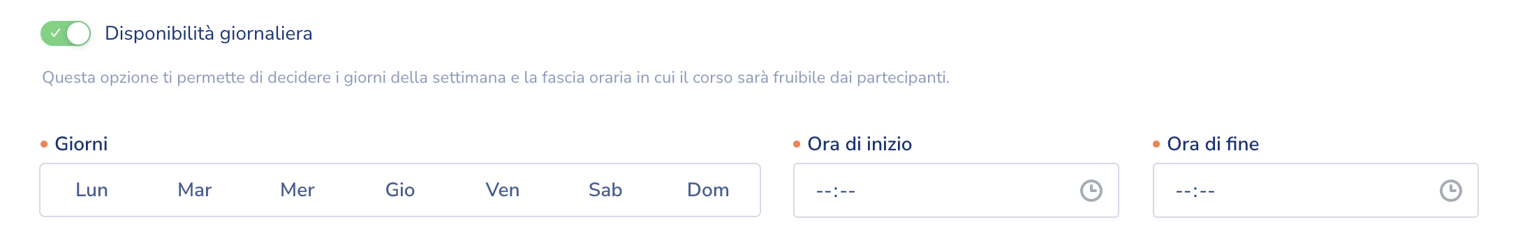 A questa opzione corrisponde l'invio della mail Corso in scadenza.Disponibilità giornaliera, opzione ti permette di decidere in quali giorni della settima e in quale fascia oraria il corso può essere disponibile agli utenti. Questa funzionalità è combinabile con il Limite di utilizzo giornaliero della piattaforma. Questa opzione ti permette di decidere in quali giorni della settima e in quale fascia oraria il corso può essere disponibile agli utenti. Questa funzionalità è combinabile con il Limite di utilizzo giornaliero della piattaforma.