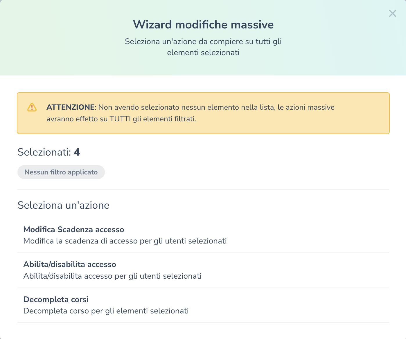 ⚠️NOTA BENE: se non selezioni alcun utente ma clicchi comunque su Azioni massive, la modifica sarà applicata a tutto l'elenco dei partecipanti a quel corso.