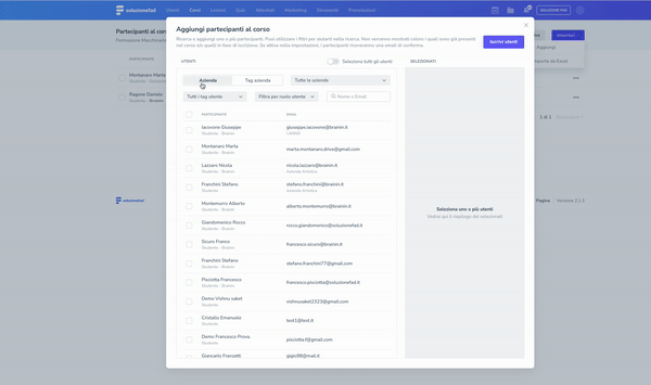 All'interno del pop up è possibile ricercare e aggiungere uno o più utenti al corso o al percorso formativo. Sono presenti diversi filtri per aiutarti nella ricerca:
