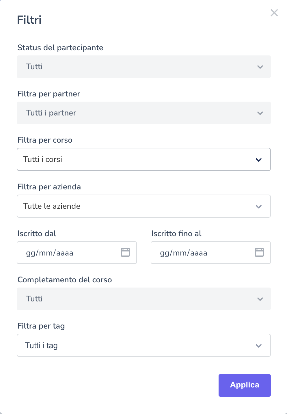 All'interno della sezione Iscrizioni per corso, avrai la possibilità di accedere ad una vista già filtrata dei partecipanti per singolo corso appunto. Nella sezione Tutti gli iscritti ai corsi, invece, i filtri potrai applicarli tu e accedere ad una reportistica più personalizzata.