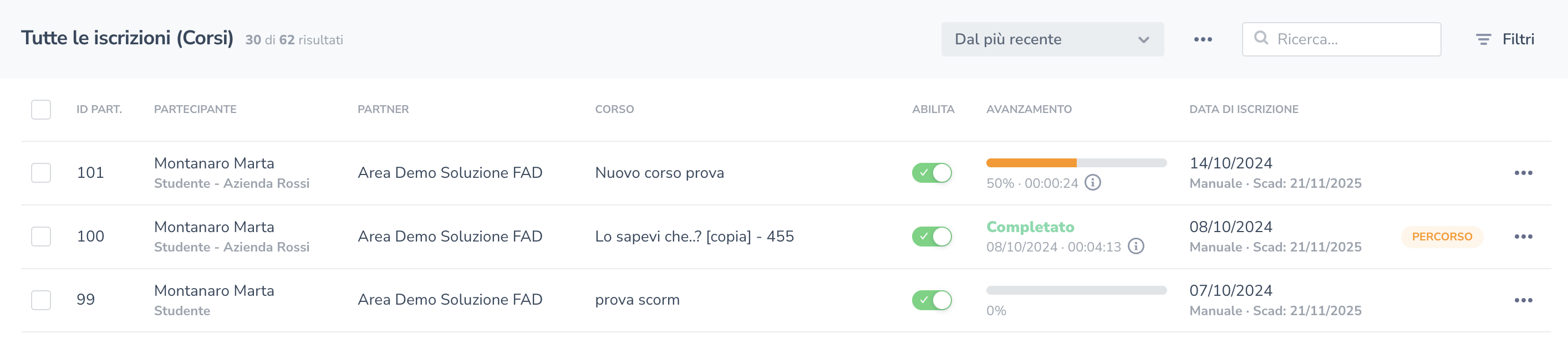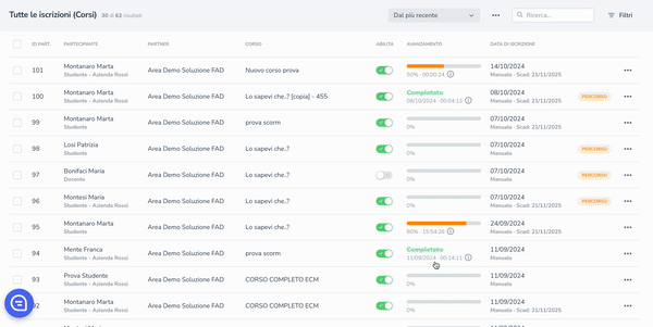 Nella sezione Tutte le iscrizioni ai corsi, vengono visualizzate tutte le partecipazioni degli utenti ai corsi. In particolare, se un utente è iscritto a più corsi, l'elenco mostrerà ciascuna partecipazione relativa ai diversi corsi.