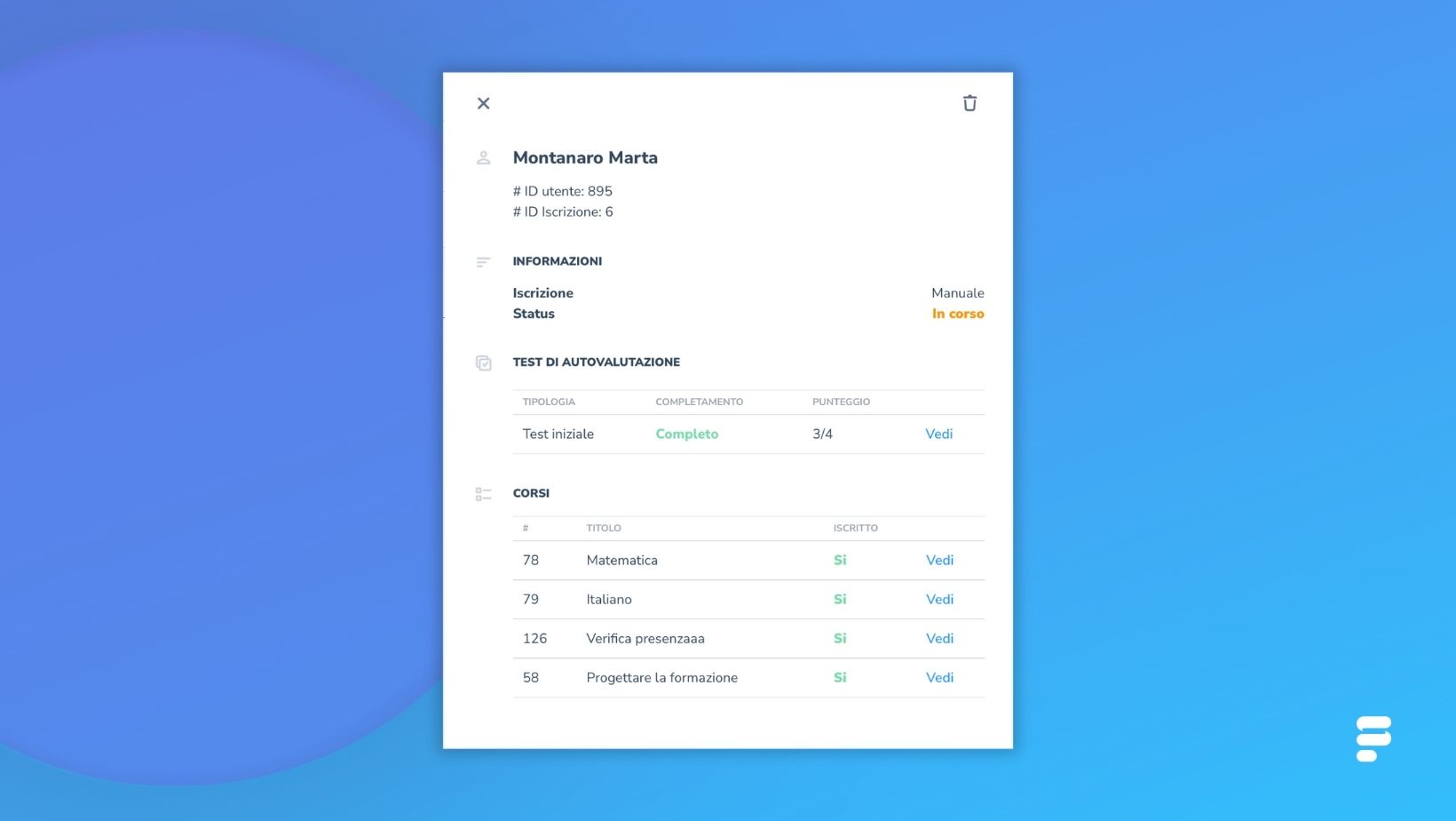 La sezione Iscrizioni al Percorso Formativo ti permette di aggiungere nuovi partecipanti, analizzarne il loro avanzamento e scoprirne i dettagli.