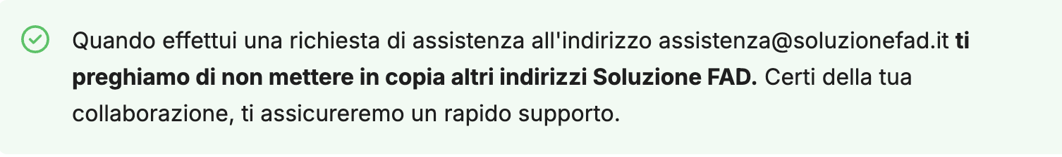 Se non trovi ciò che cerchi o hai bisogno di assistenza manda un'email a assistenza@soluzionefad.it oppure contattaci tramite lo strumento di Live Support presente in piattaforma. Ti basterà cliccare sull'icona in basso a sinistra. Ti ricordiamo che osserviamo i seguenti orari lavorativi: