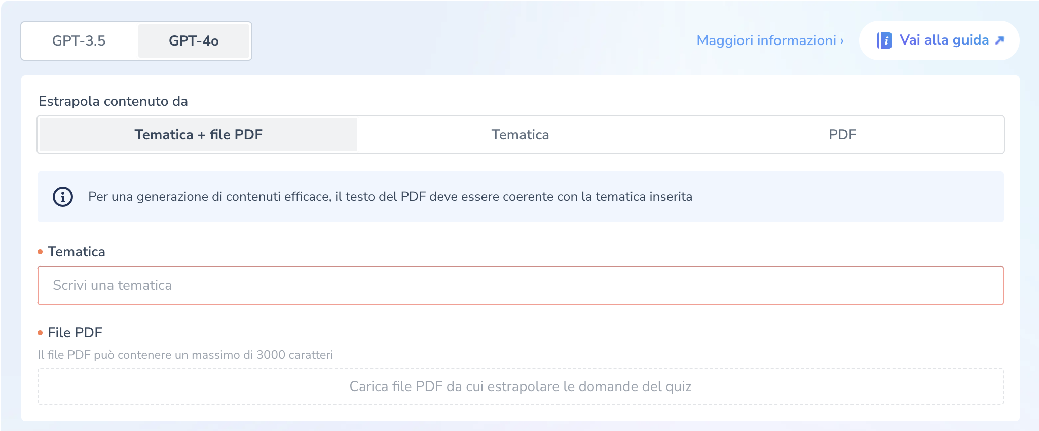 L’AI non è solo un assistente, ma un vero e proprio alleato nella creazione dei quiz. In piattaforma, il processo è studiato per essere semplice e chiaro. Prima di confermare la generazione, l’utente ha accesso a un riepilogo dettagliato della richiesta. Questo permette di verificare che tutti i parametri inseriti siano corretti prima di procedere. Tale funzionalità è cruciale: evitare errori nella definizione dei quiz significa risparmiare tempo e token.