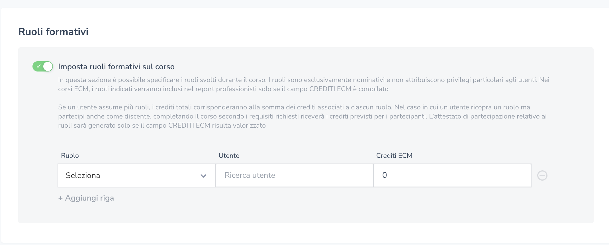 Nei corsi ECM, i ruoli indicati verranno inclusi nel report professionisti solo se il campo "CREDITI ECM" è compilato.
