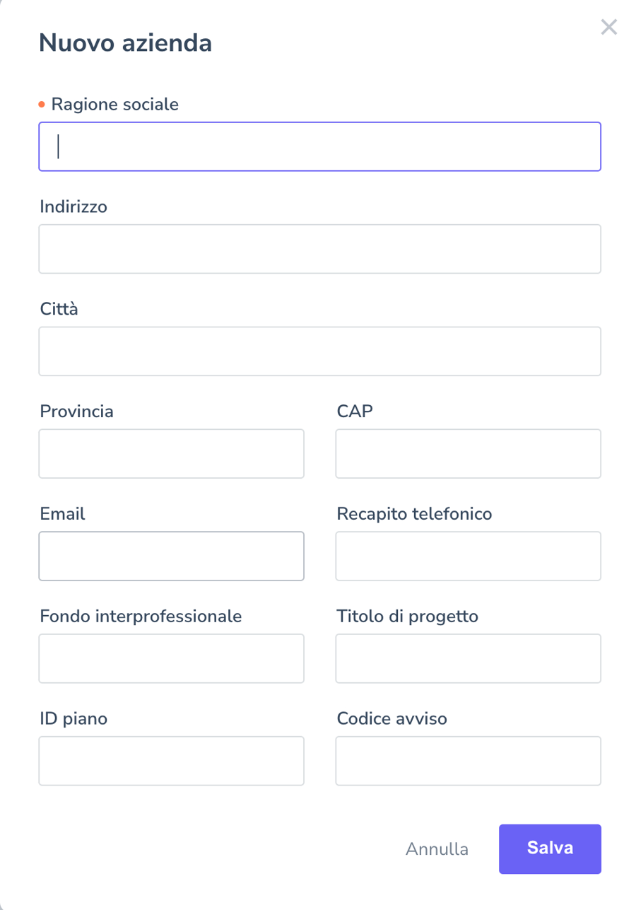 Un’altra possibilità è creare un’azienda direttamente durante la fase di creazione o modifica di un discente. In questo caso, dal menù a tendina relativo all’azienda, è possibile selezionare l’opzione +Nuova azienda. In questo modo, si potrà inserire immediatamente una nuova azienda senza dover uscire dal flusso di lavoro.