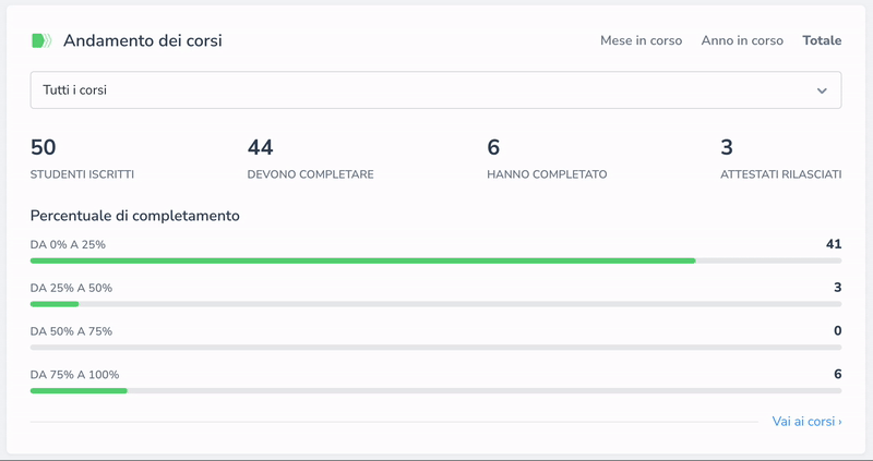 Grazie alla sezione Andamento dei corsi, puoi monitorare l’andamento di tutti i corsi o selezionare uno specifico. Puoi filtrare i risultati per mese, anno o totale e visualizzare informazioni su studenti iscritti, percentuale di completamento e attestati rilasciati.