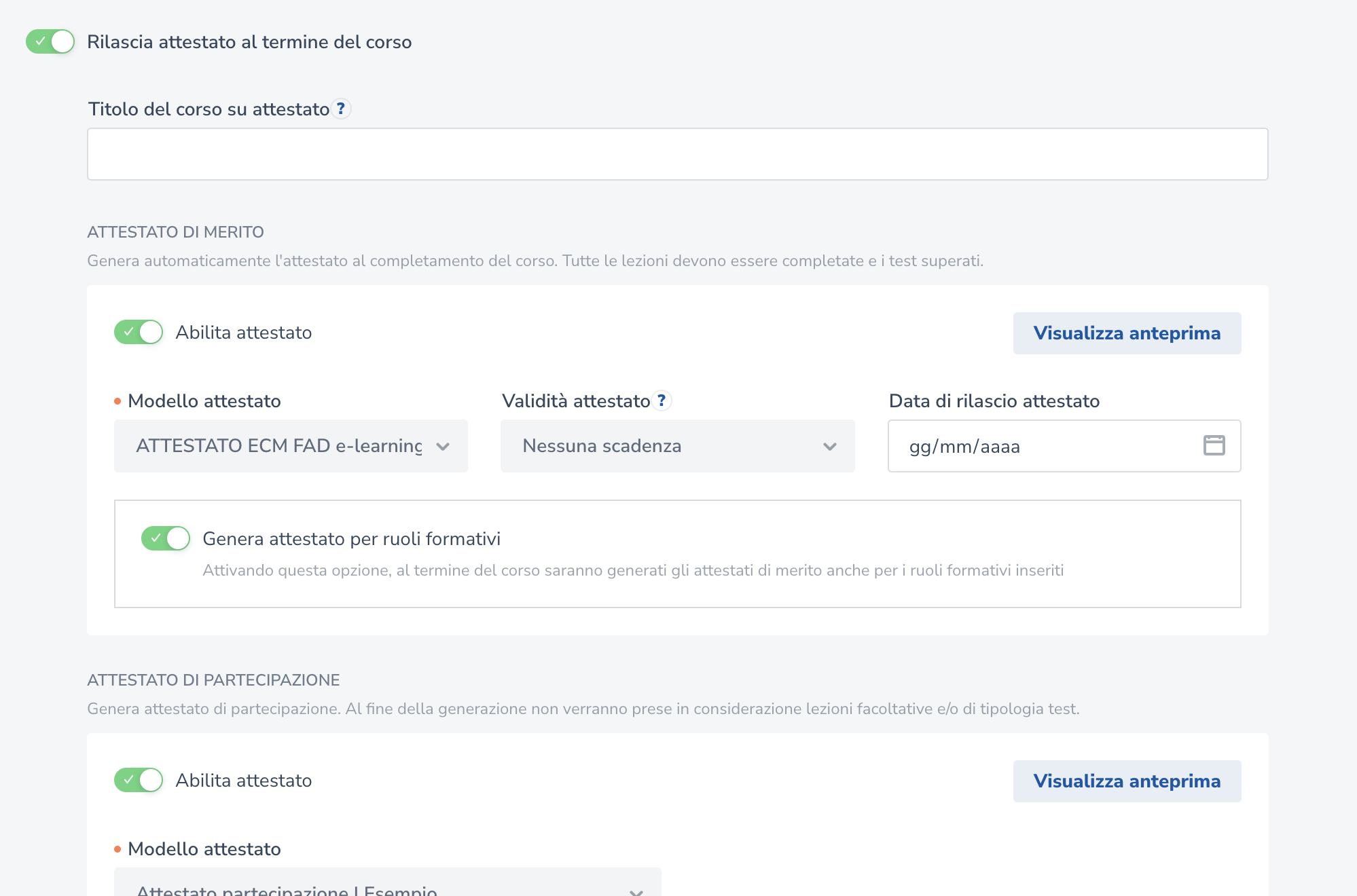 Se un utente è sia partecipante che in un ruolo formativo, riceverà solo l’attestato da partecipante, a condizione che abbia completato il corso rispettando tutti i requisiti.