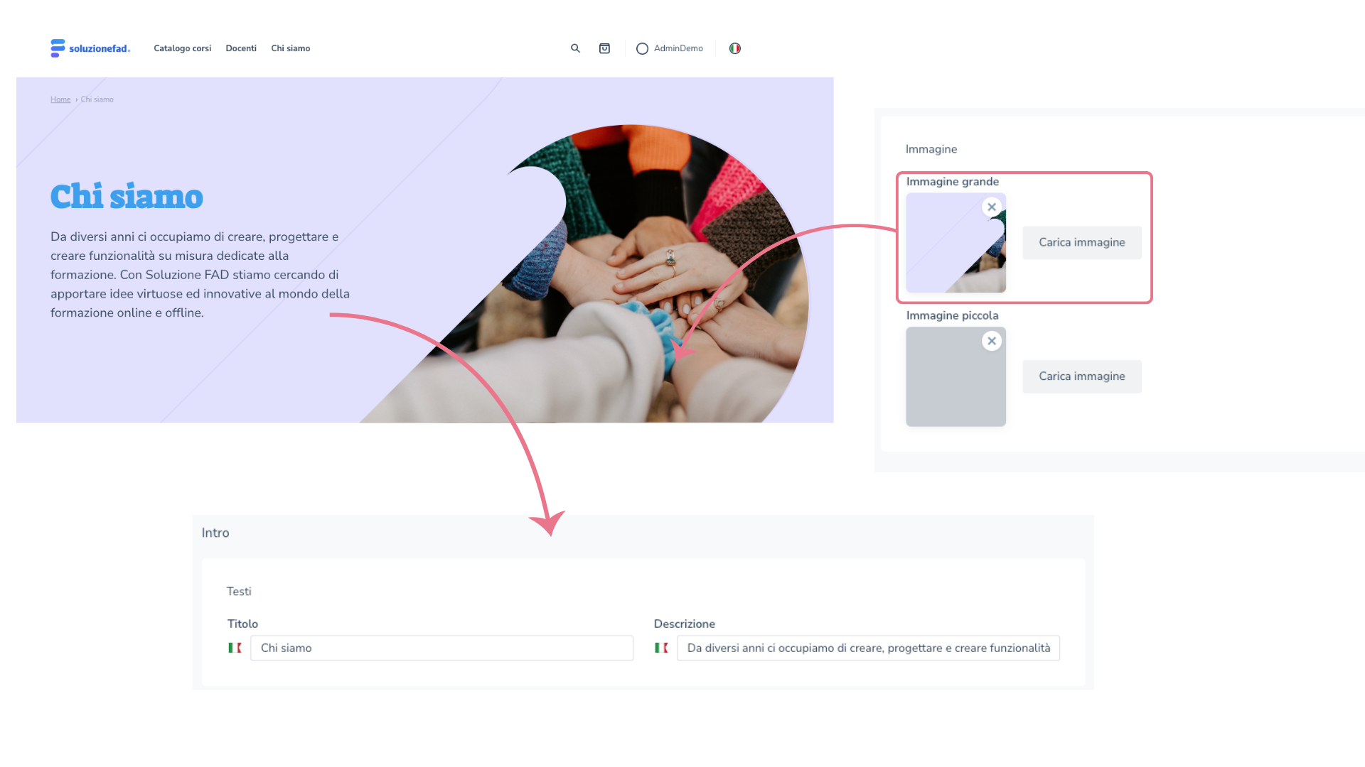 Intro: inserisci il titolo e la descrizione che verranno mostrati nel banner introduttivo in cui introduci brevemente il tuo corpo docenti.