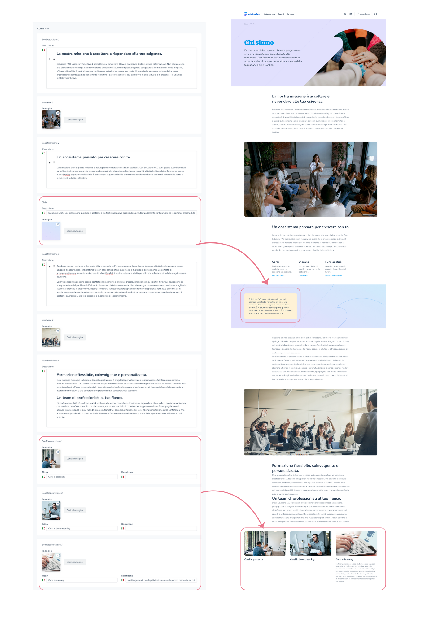 Nella sezione Contenuto sono disponibili fino a quattro box descrittivi, ciascuno accompagnato da un’immagine. Ogni box può essere personalizzato tramite un editor HTML, utile per costruire la pagina "Chi siamo". Le immagini caricate verranno visualizzate in larghezza massima (max width). Si consiglia di utilizzare immagini orizzontali con rapporto 4:3 o 16:9, così da garantire un corretto adattamento al layout della pagina.