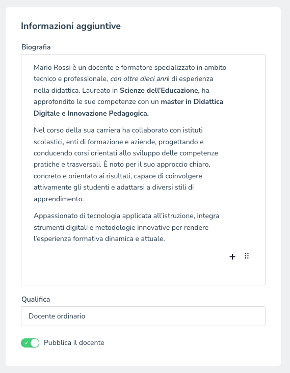 In questa sezione saranno pubblicati i docenti che all'interno della loro anagrafica hanno la spunta attiva sull'opzione PUBBLICA DOCENTE. È altresì possibile inserire link diretti alle pagine social del docente stesso.