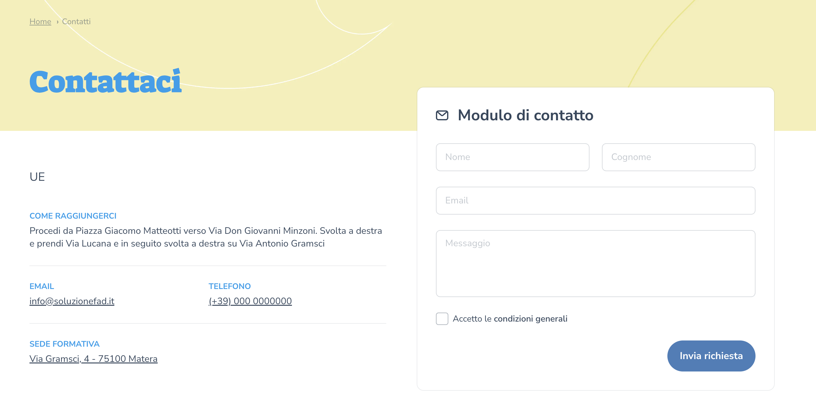 Punti di forza: gestisci tre box informativi, ciascuno composto da titolo e descrizione, utili per evidenziare i vantaggi competitivi della tua offerta (es. master, corsi accreditati, workshop). I punti di forza sono visibili nella pagina CHI SIAMO e nel box CLAIM presente in HOME.