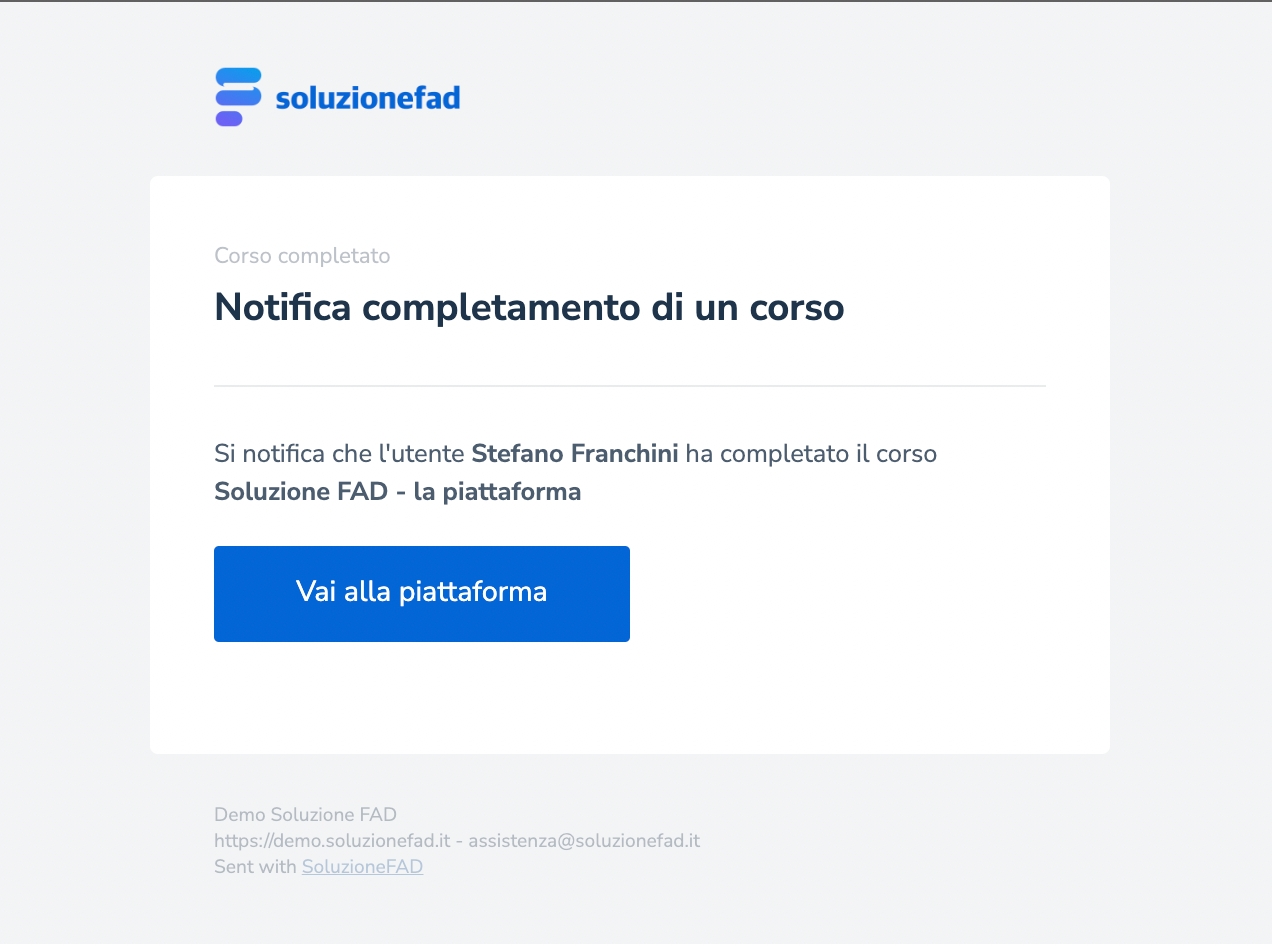 viene inviata una email e una notifica in piattaforma agli amministratori per comunicare il completamento del corso da parte dell'utente.