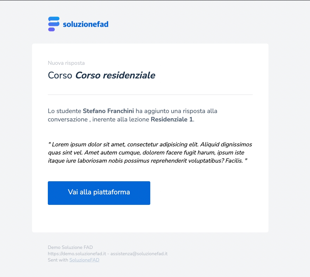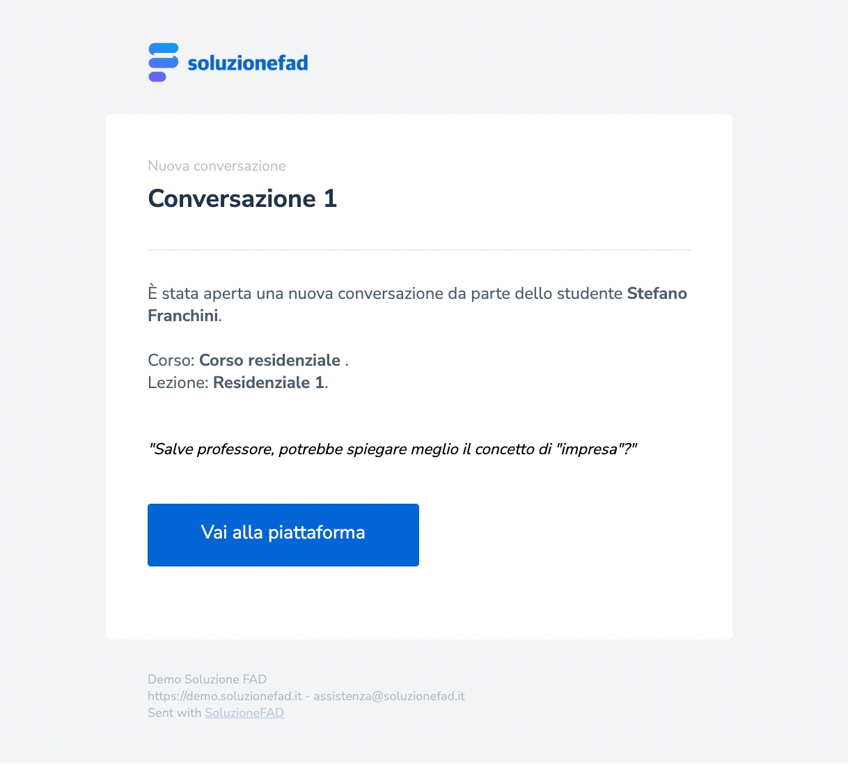 Email di apertura di una nuova conversazione inviata quando un discente avvia una conversazione all’interno dei corsi (attiva con il modulo Domande e Risposte). Ogni volta che la conversazione viene aperta, arriva un email a tutti i docenti e i tutor del corso e agli admin.
