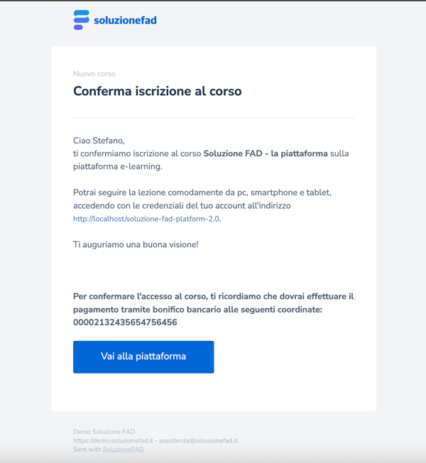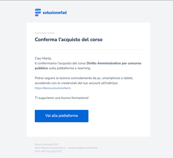 vengono inviate un'email e una notifica agli utenti per confermare l'iscrizione ad un nuovo corso avvenuta tramite caricamento manuale da parte degli amministratori o a seguito di un acquisto da parte dell’utente stesso.