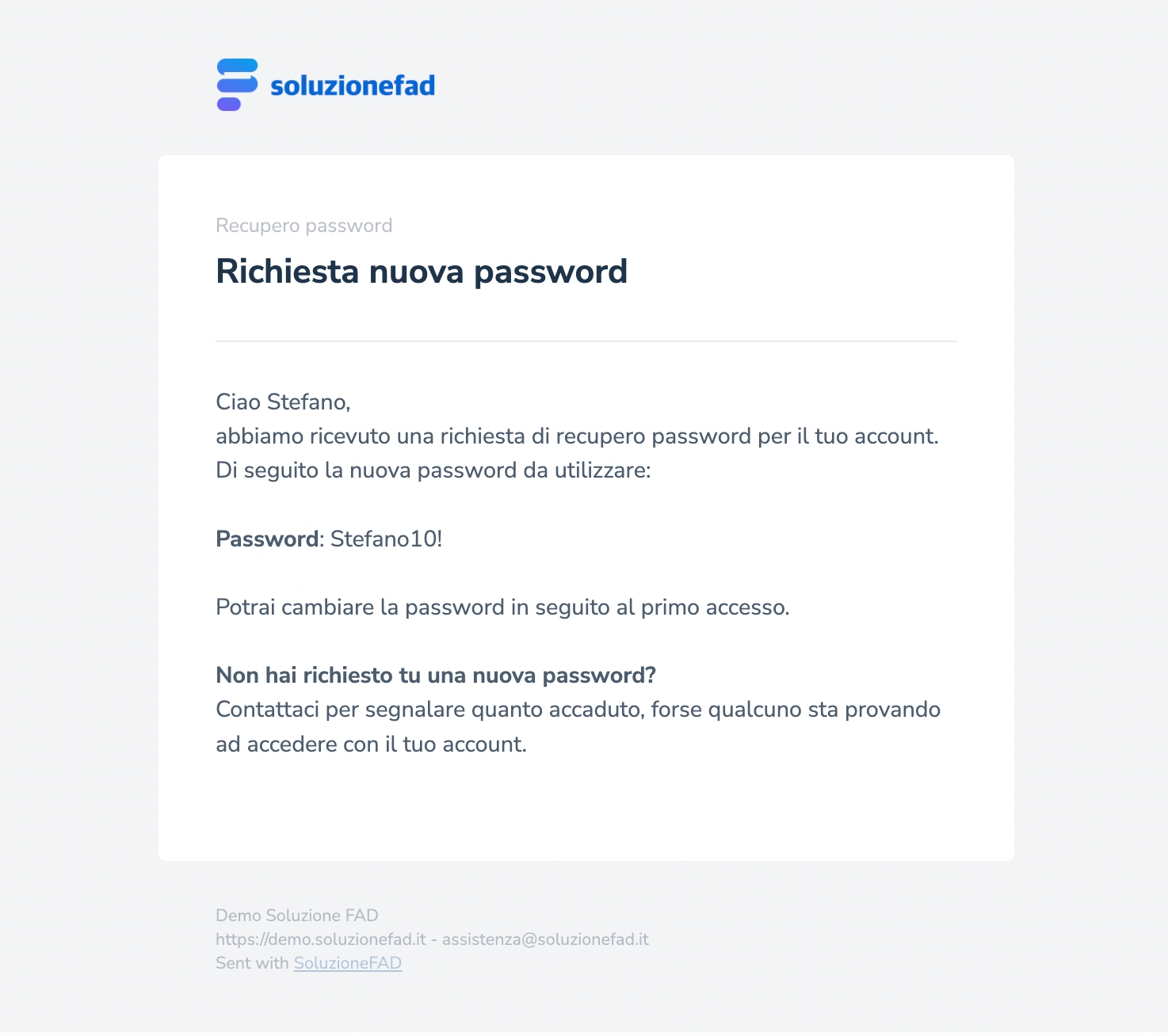 Email di recupero password che viene inviata su richiesta dell'utente. Contiene una nuova password generata automaticamente dalla piattaforma.
