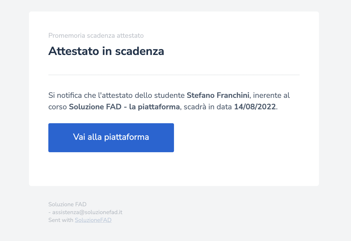 vengono inviate un'email e una notifica in piattaforma agli utenti per comunicare la scadenza imminente di un attestato. L’invio avviene 15 e 7 giorni prima della data di validità impostata.