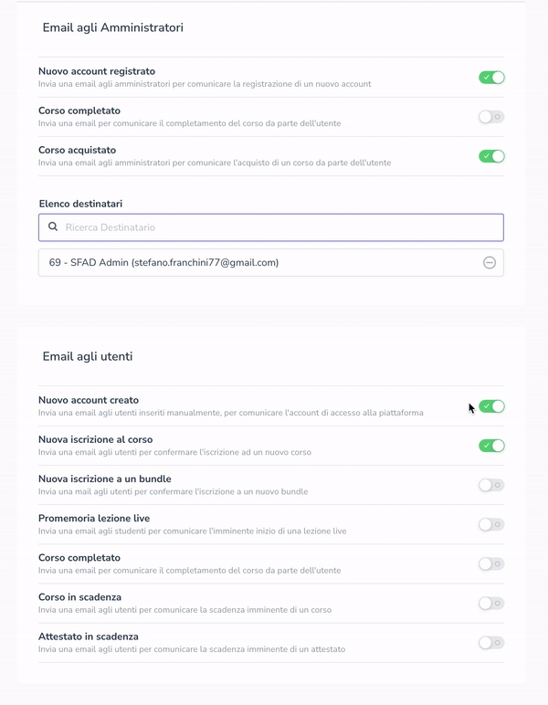 In base al piano Soluzione FAD attivo, hai a disposizione una serie di email e notifiche che puoi attivare.