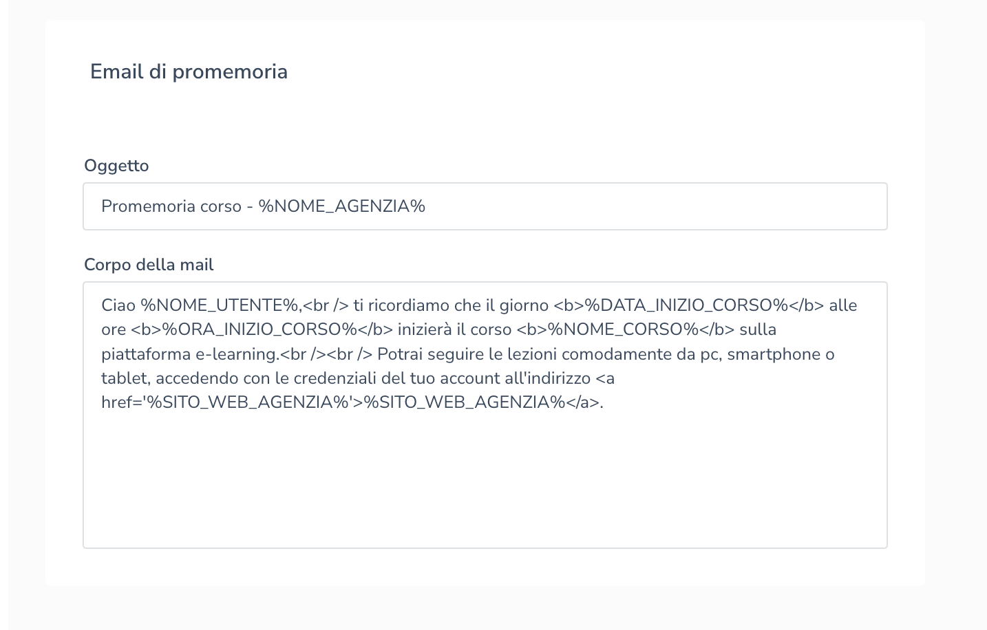 %ORA_INIZIO_CORSO% → Orario in cui il corso inizierà. Questa opzione sarà valida solo per i corsi di tipologia Evento