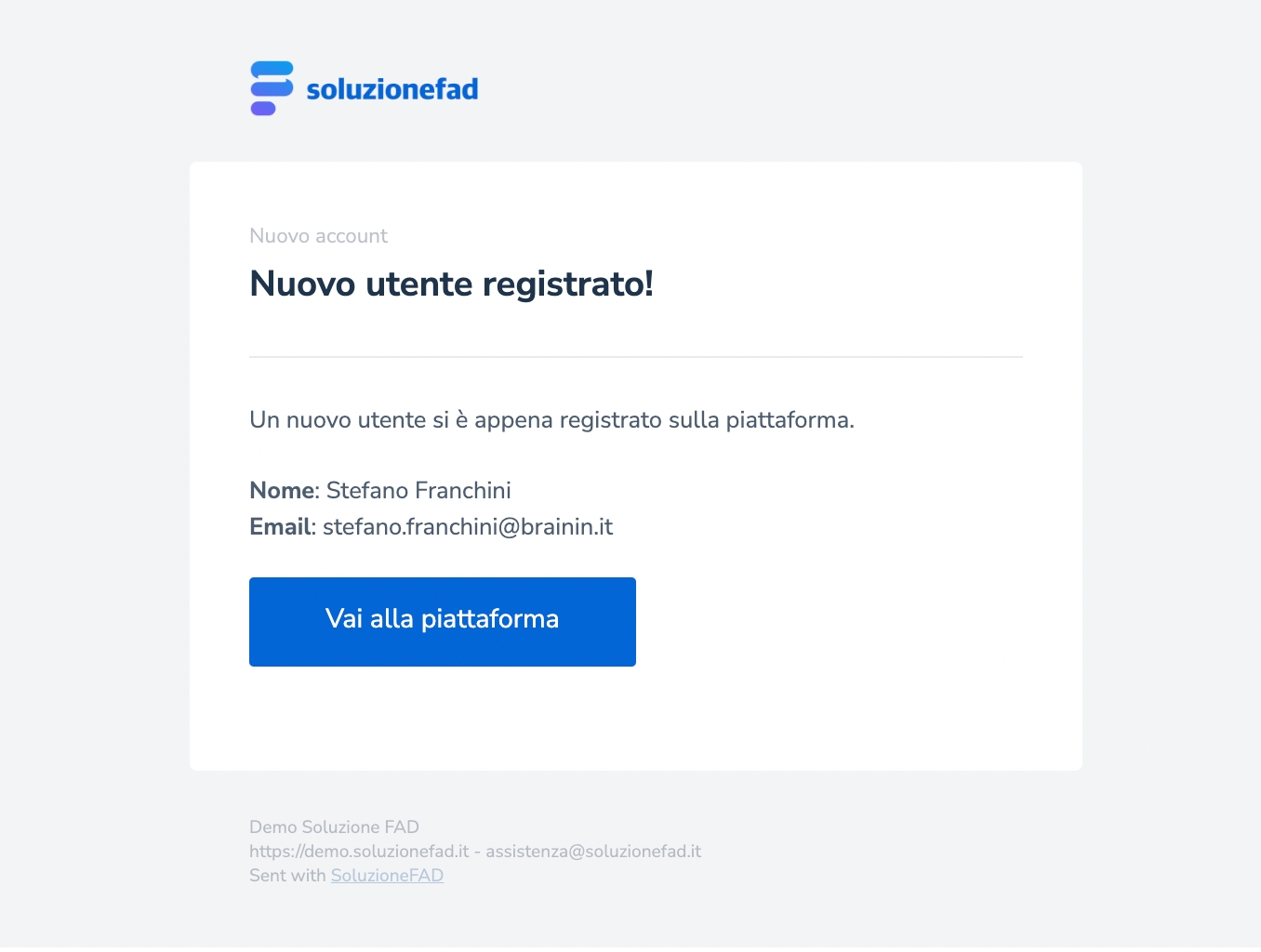 vengono inviate un'email e una notifica in piattaforma agli amministratori per comunicare la registrazione di un nuovo account nel momento in cui un utente si registra in autonomia.
