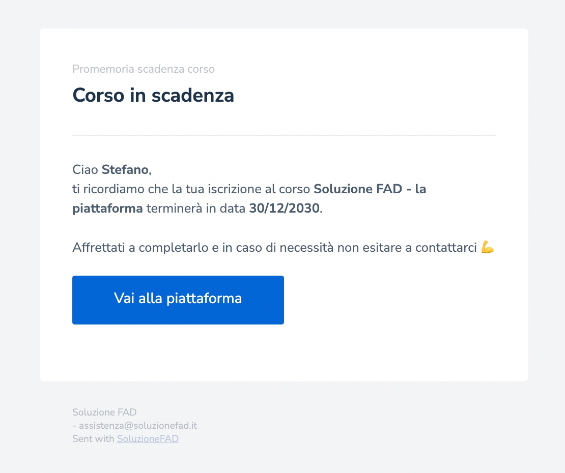 vengono inviate un'email e una notifica in piattaforma agli utenti per comunicare la scadenza imminente di un corso. L’invio avviene 10 e 5 giorni prima della data di scadenza impostata sul partecipante al corso.