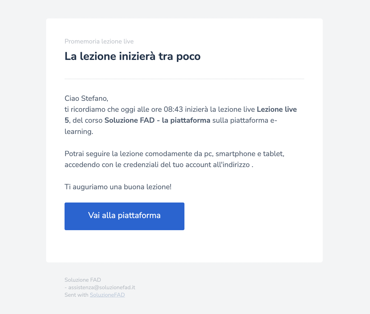 vengono inviate un'email e una notifica in piattaforma agli studenti per comunicare l'imminente inizio di una lezione live. L’invio avviene 60 minuti prima della data di inizio lezione impostata. Inoltre verrà visualizzato dagli utenti un box all’interno della propria area.