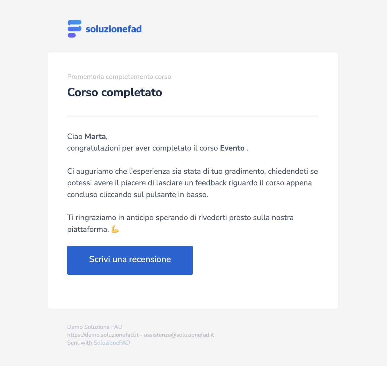 Se hai attivo il modulo recensioni, l'email di completamento corso inviterà gli utenti a scrivere una recensione riguardo il corso appena completato.