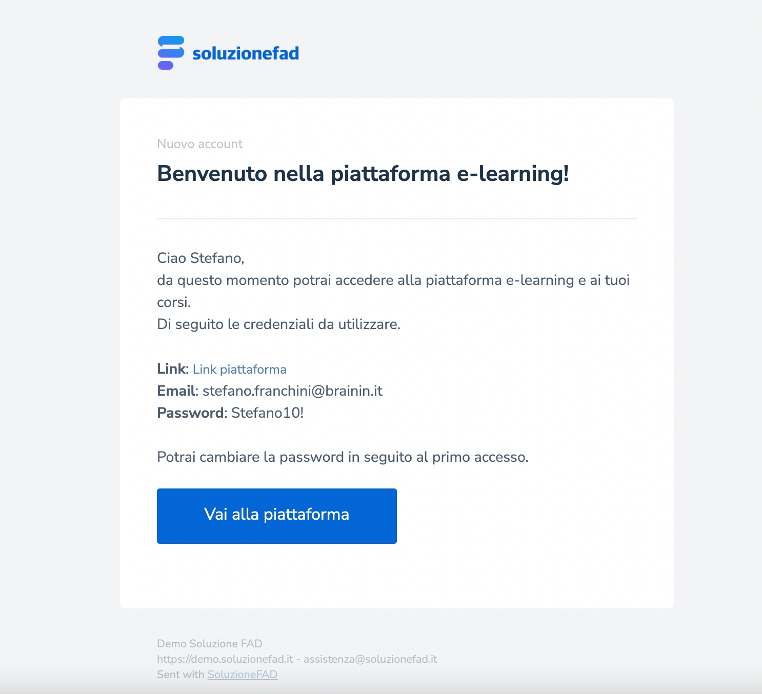 viene inviata un'email agli utenti inseriti manualmente dagli amministratori per comunicare le credenziali (email e password) di accesso alla piattaforma.