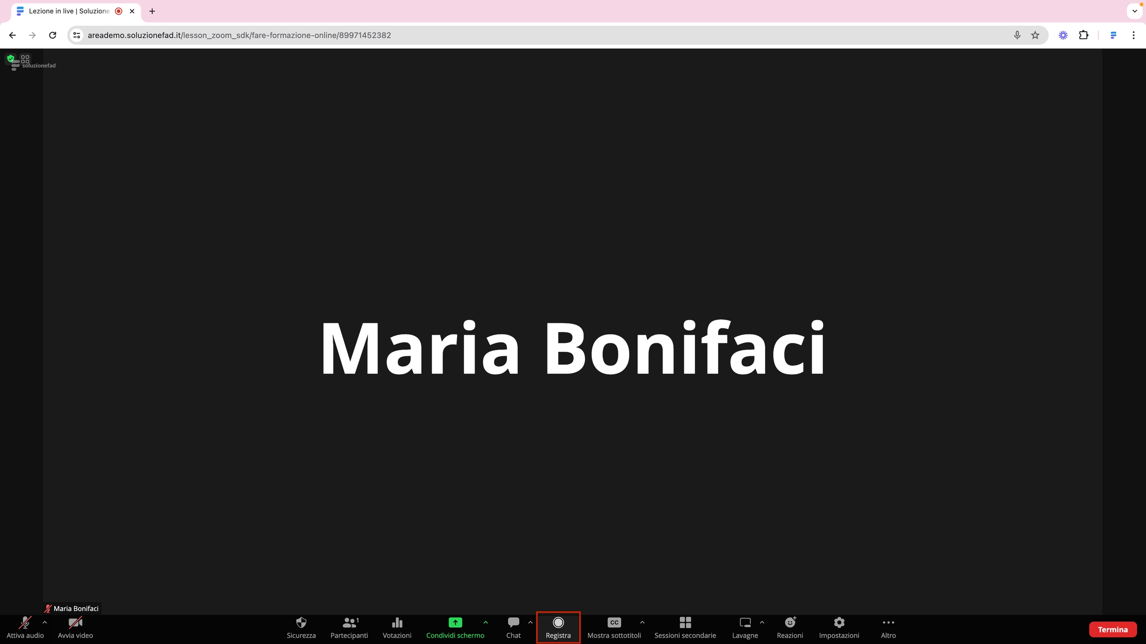 All'interno dell'aula puoi avviare una registrazione che sarà salvata all'interno dell'archivio di Soluzione FAD oppure sostituita automaticamente all'evento appena concluso se attiva l'impostazione "Rendi e-learning una volta completata"