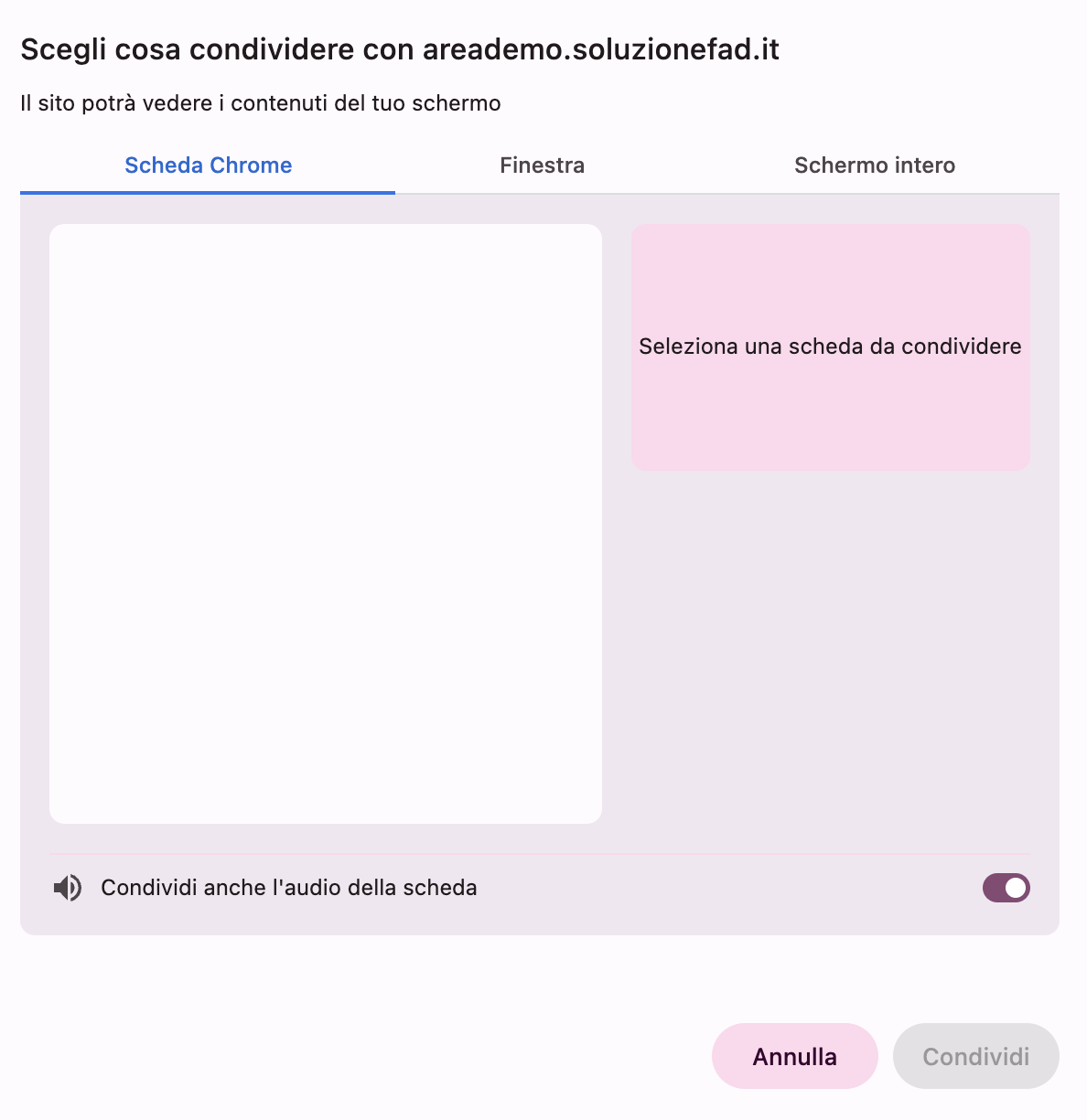 Una volta cliccato sul tasto avrai la possibilità di scegliere cosa condividere. Se hai la necessità di condividere anche l'audio del tuo dispositivo, riproduci il file o programma su una pagina del browser. In seguito scegli Scheda Chrome e abilita l'audio cliccando in basso a destra.