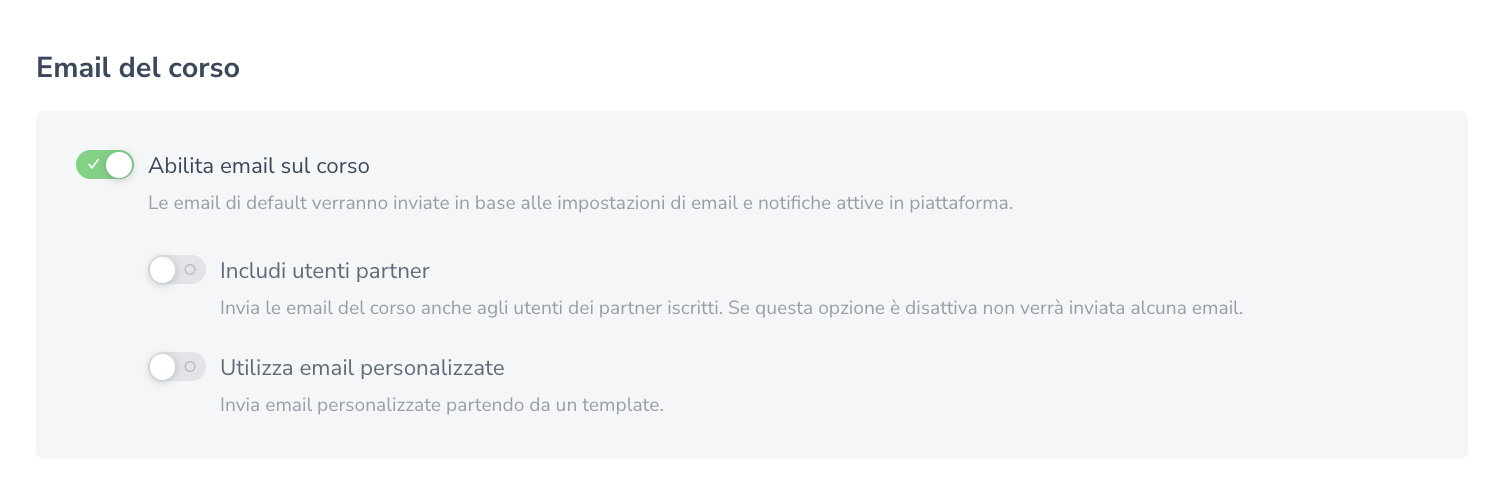 All'interno di questa sezione hai la possibilità di decidere quali email legate al corso debbano essere inviate e in che modalità.