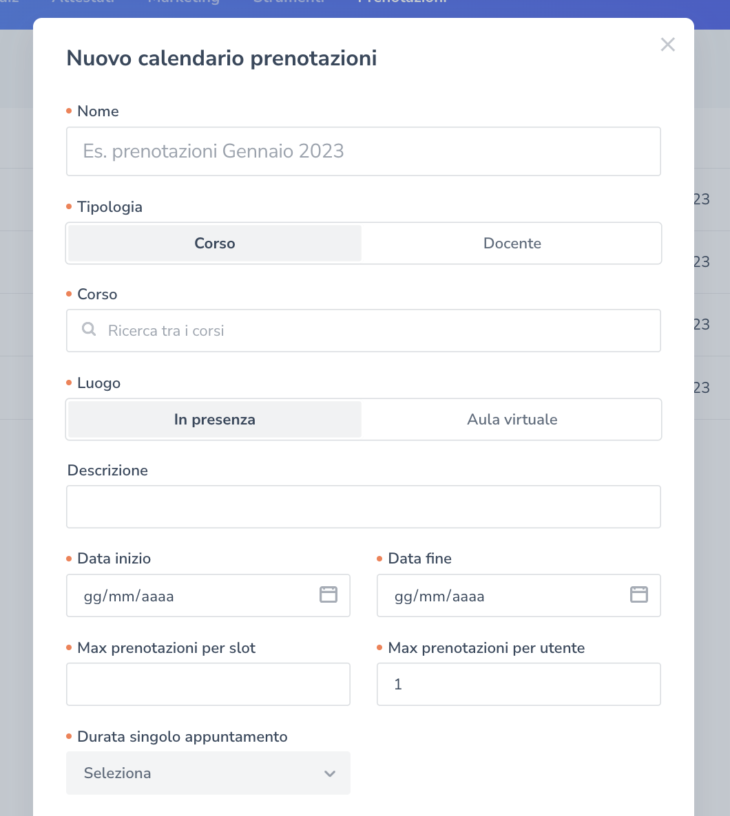 Il calendario inoltre può essere utilizzato sia per appuntamenti ed esami in presenza che in aula virtuale. Nel caso in cui si scelga la presenza, consigliamo di compilare il campo descrizione inserendo i dettagli (luogo, etc).