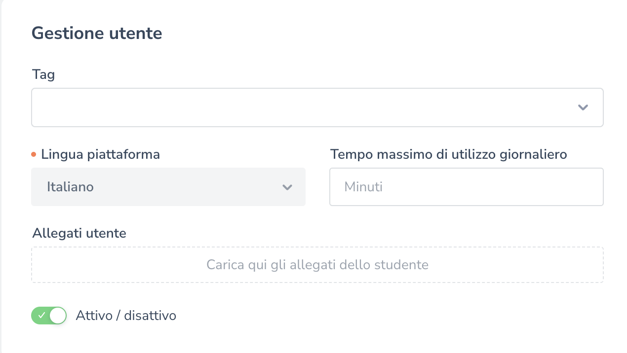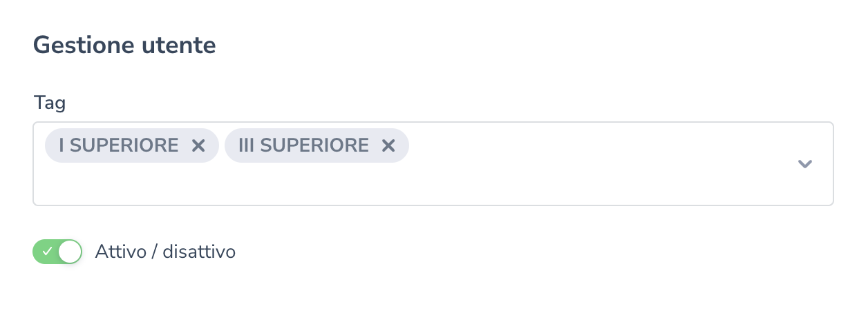 Ogni utente può essere associato a uno o più tag che funzionano come etichette utili per raggruppare utenti con caratteristiche simili ed eseguire azioni massive o controlli specifici su gruppi di utenti. Questa funzione facilita la segmentazione e la gestione organizzata degli utenti.