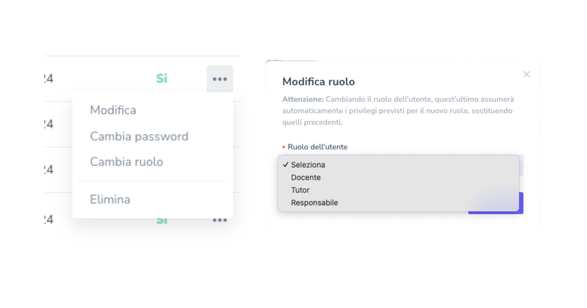 Per modificare il ruolo di un utente, clicca sui tre puntini accanto al suo nome e seleziona l’opzione "Cambia ruolo". A questo punto, scegli il nuovo ruolo che desideri assegnargli. Una volta effettuata la modifica, l’utente acquisirà automaticamente i privilegi associati al nuovo ruolo, perdendo quelli del ruolo precedente.