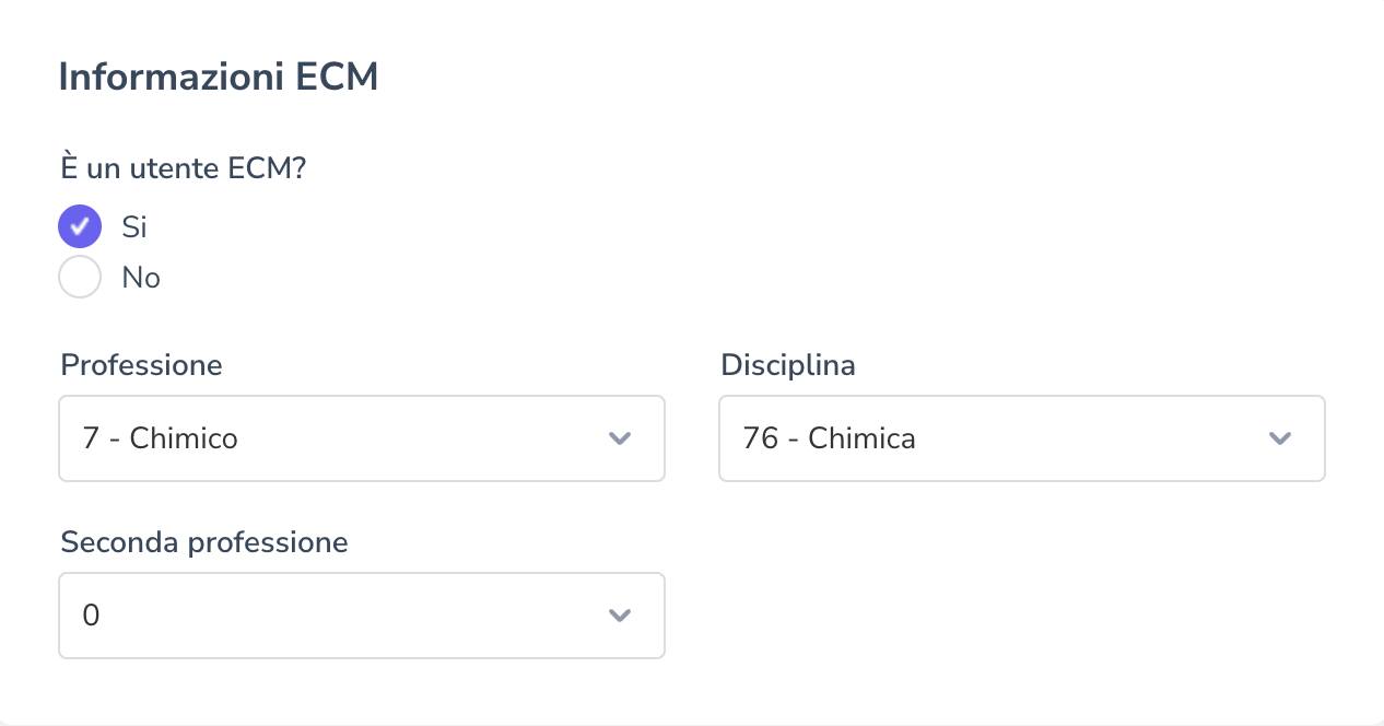 Utente ECM: al fine di consentire l'inserimento delle informazioni del professionista richieste da Agenas, è necessario dichiarare se l'utenza in fase di attivazione sia di tipo ECM oppure no. Dichiarando di essere utente ECM, saranno obbligatori i campi professione e disciplina. Ad ogni professione corrispondono, come da linee guida, delle specializzazioni in maniera univoca. Nel caso in cui l'utente ne abbia solo una, dovrà compilare solo la prima coppia. Nel caso in cui abbia più professioni oppure a pari professione più specializzazioni, è possibile compilare anche le altre coppie di campi.