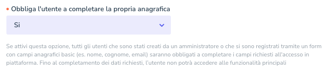 Nella sezione GENERALI delle impostazioni, puoi attivare l'opzione che ti permette di obbligare l'utente a completare la propria anagrafica. Questa impostazione fa in modo che l'utente non possa navigare fino al completamento dei dati richiesti.
