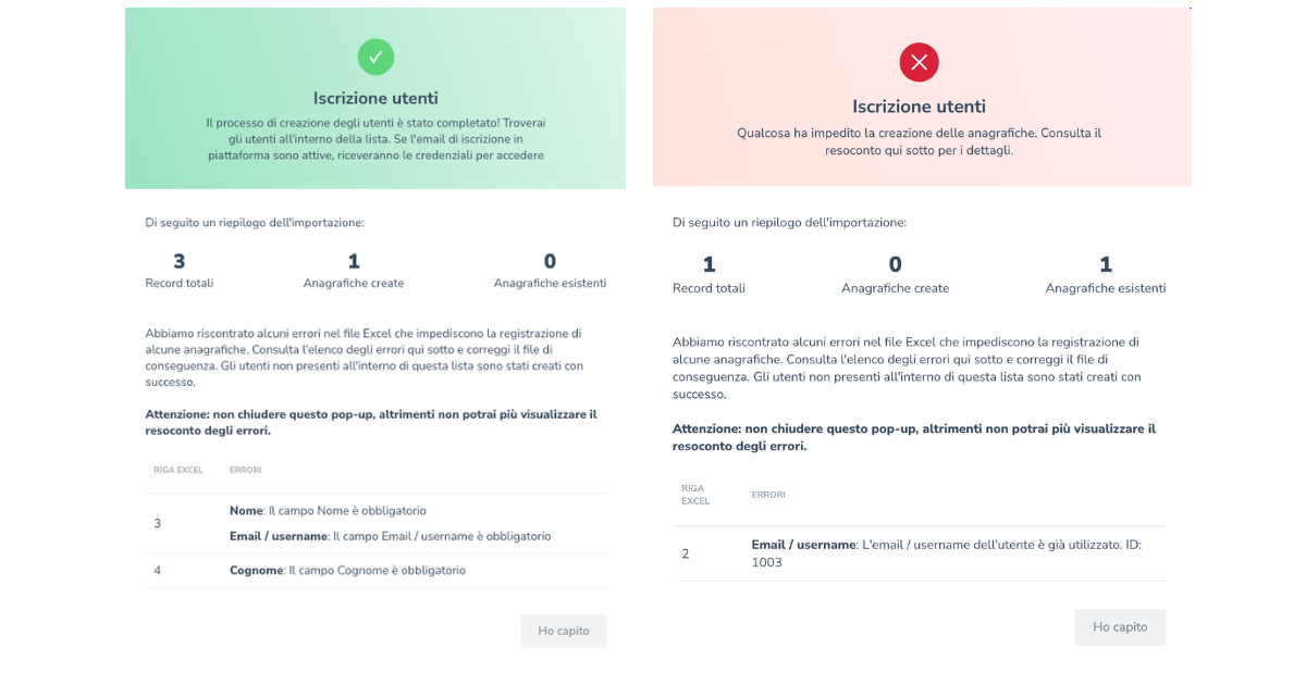 A seguito di importazione, la piattaforma potrebbe darti feedback diversi.